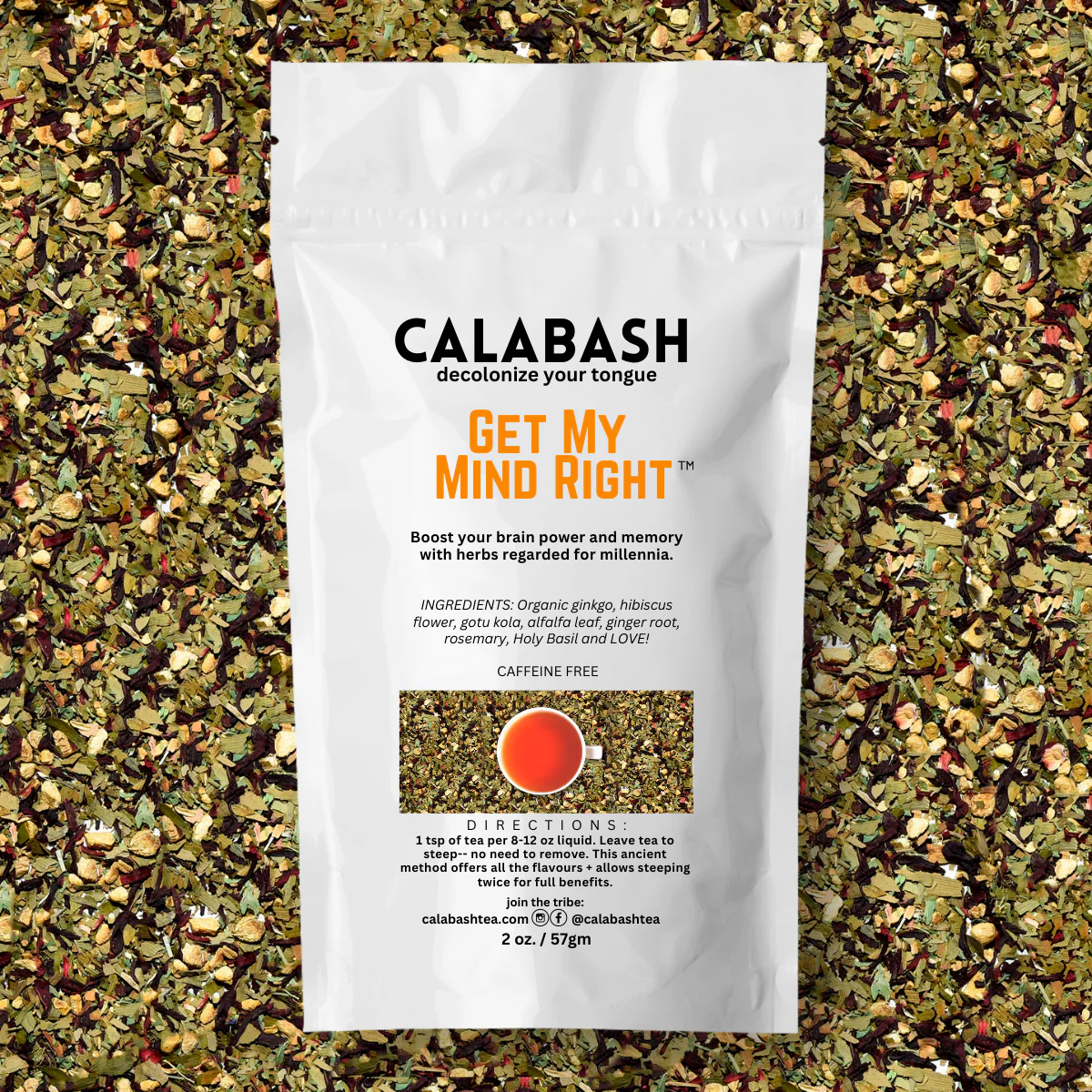 Loose Tea (20 servings). Yay for brain power with ancient herbs! Boost your brain power with memory enhancing herbs such as ginkgo and gotu kola, and healthful antioxidants. Not caffeinated. INGREDIENTS: Organic ginkgo, hibiscus flower, gotu kola, alfalfa leaf, ginger root, Holy Basil and High Energy Love!