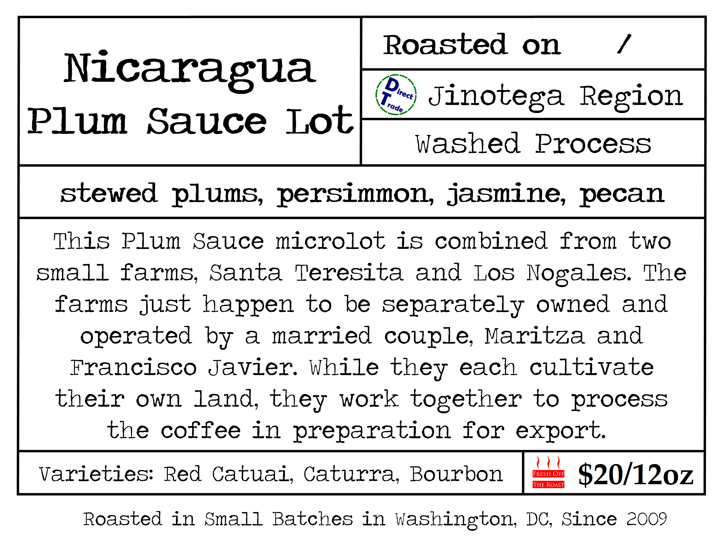 This Plum Sauce microlot is combined from two small farms, Santa Teresita and Los Nogales. The farms just happen to be separately owned and operated by a married couple, Maritza and Francisco Javier. While they each cultivate their own land, they work together to process the coffee in preparation for export.