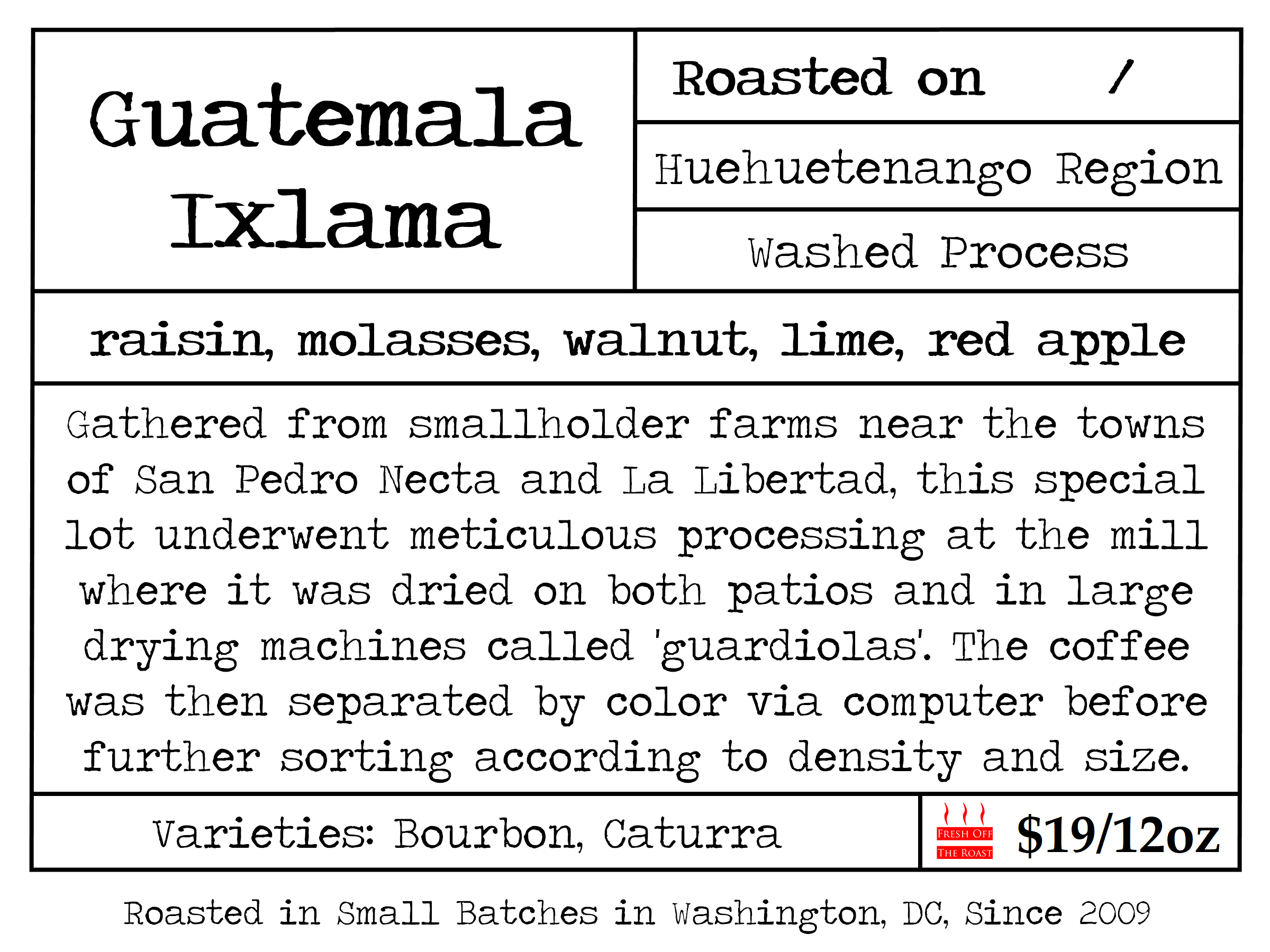Gathered from smallholder farms near the towns of San Pedro Necta and La Libertad, this special lot underwent meticulous processing at the mill where it was dried on both patios and in large drying machines called 'guardiolas'. The coffee was then separated by color via computer before further sorting according to density and size.