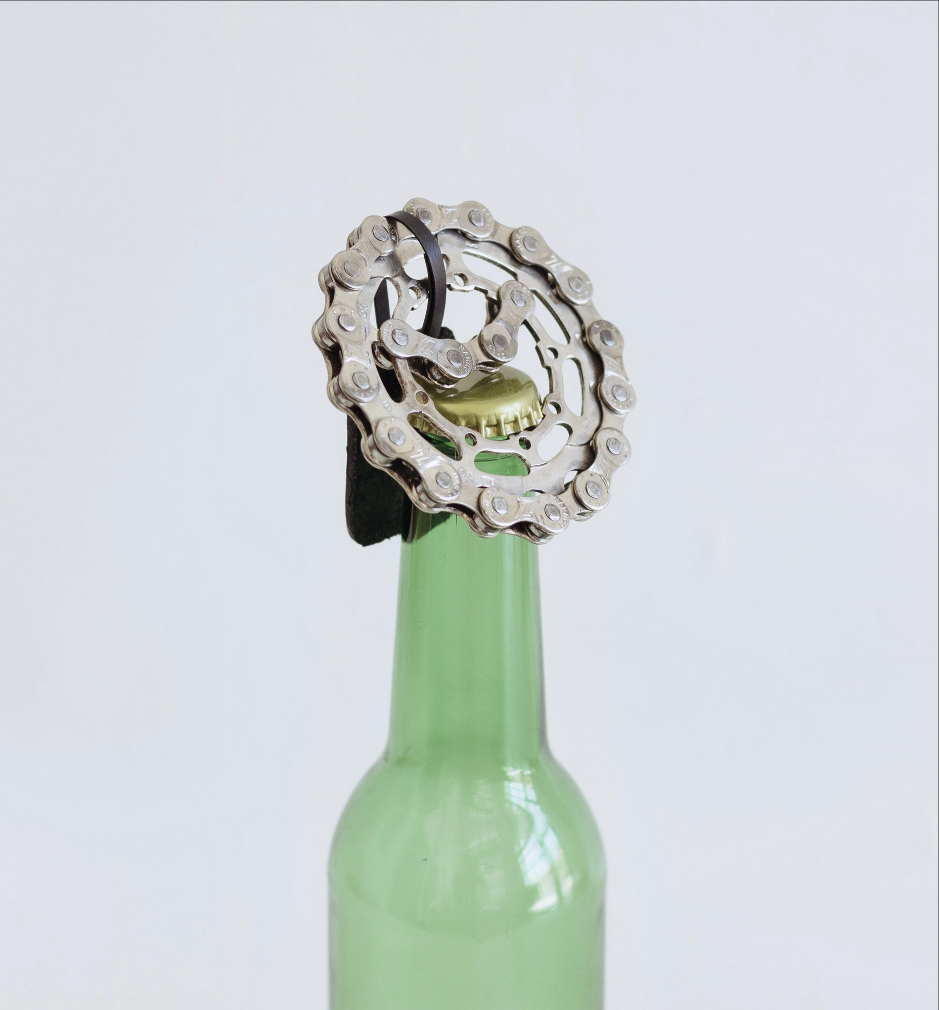 Each opener is made from a used bicycle gear and chain. Sizes and coloring vary slightly, depending on the first life of the materials as bicycle parts. However, all bottle openers are free of grease and polished with a steel brush to bring out a subtle luster. Specifications: Exterior chain is secured loose, and shakes in place a little. Interior chain links have been hammered to make them rigid. Branded with a leather embossed tag attached with inner tube cord. Each bottle opener is unique, and pieced together by hand. Approximately 2.5" in diameter, and .5" thick. Handmade in DC