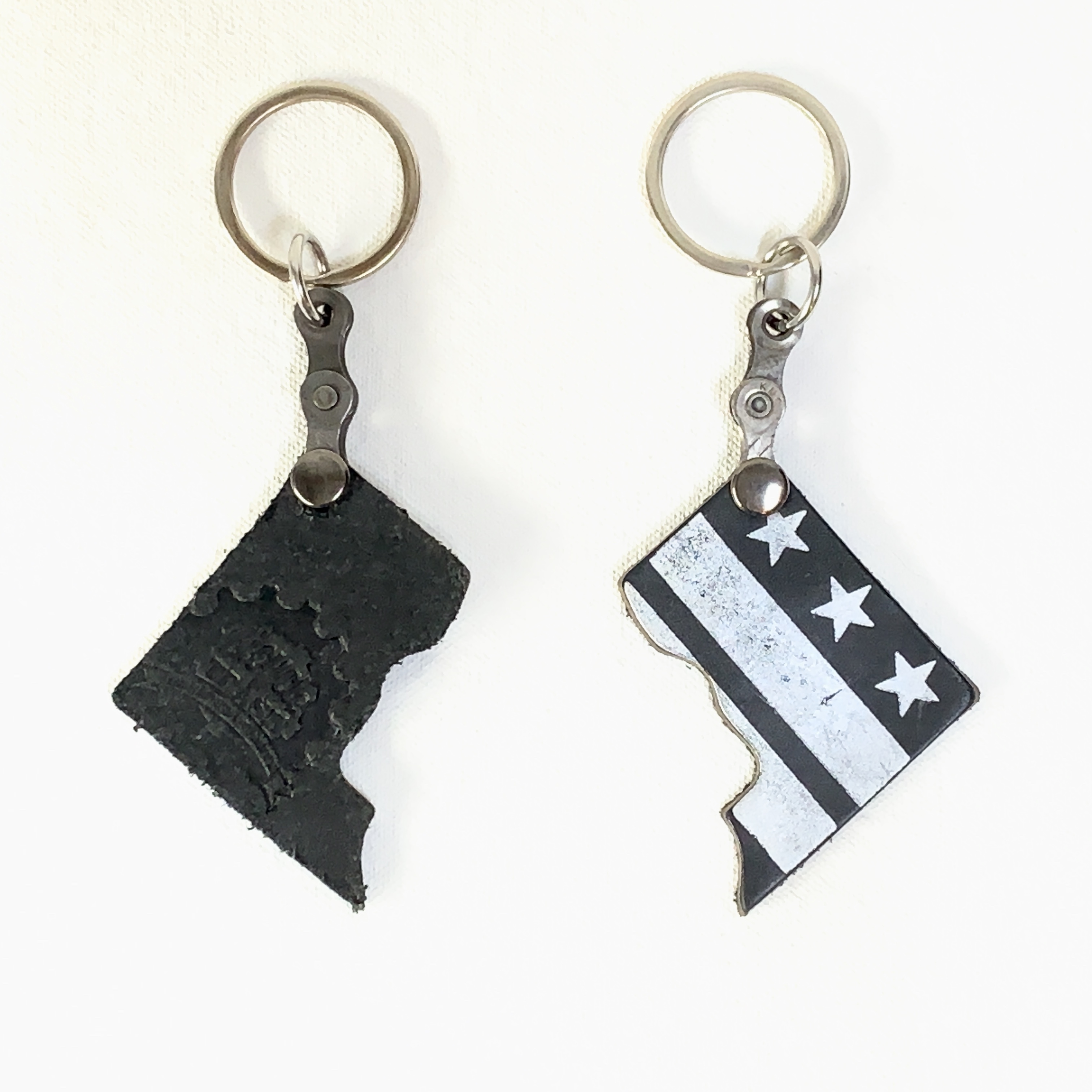 The DC Keychain is made with scrap leather, die cut in shape of the District of Columbia, and attached to a split ring with links of bicycle chain. The DC flag is stamped on one side, and the Bicycle Trash logo is embossed on the other. (Available in red on white, or silver on black.)