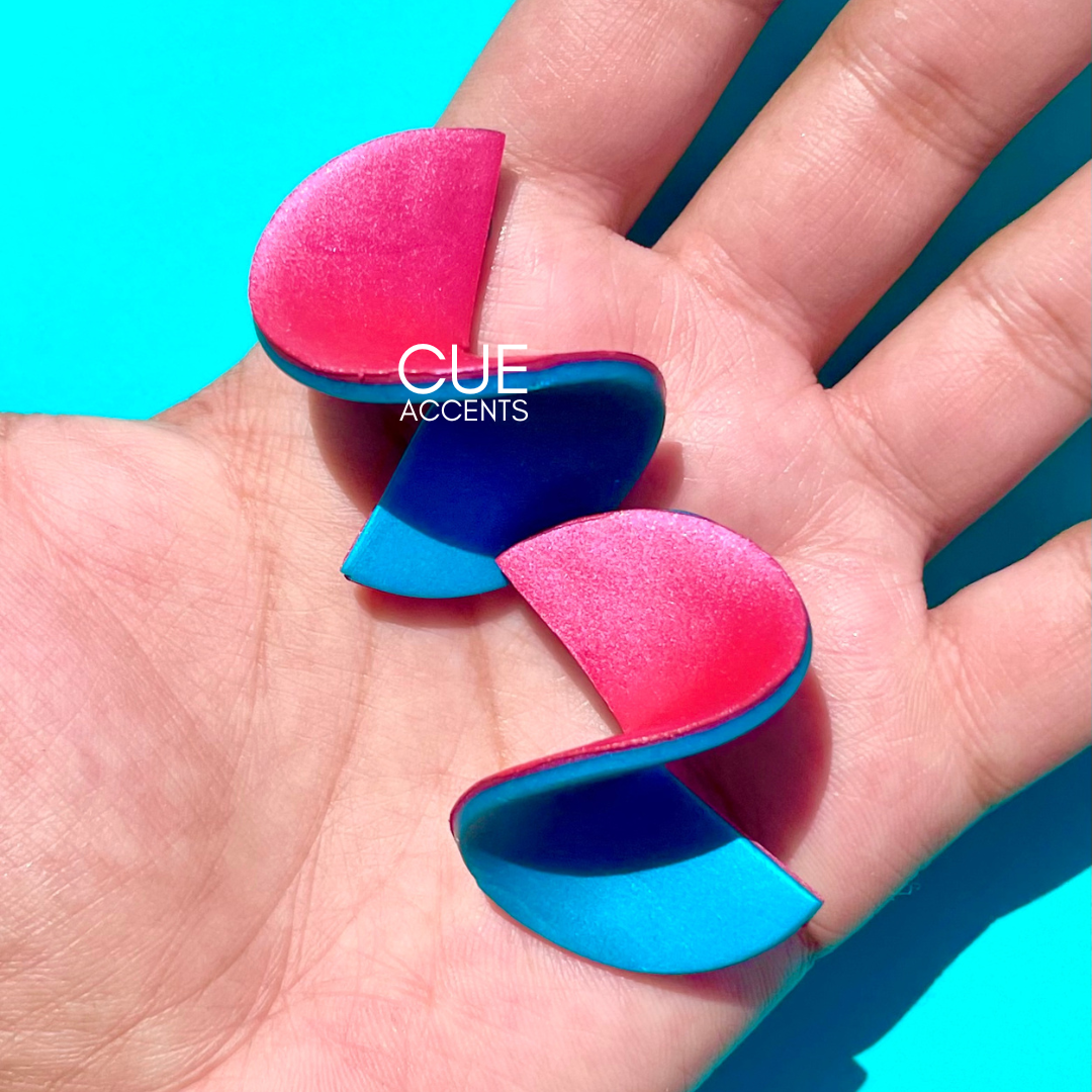 The Twister Polymer Clay Earrings, Hypoallergenic, Stud Earrings, Unique Earrings, Lightweight Earrings, Abstract, Statement Earrings, Gift Add a twist with The Twister statement earrings! Made of polymer clay and stainless steel, this pair is both lightweight and hypoallergenic. This statement piece is the perfect flair for your most casual fits, and further accentuates a more bold look. With one side in magenta pink, and the other peacock blue, it’s the perfect twist to any fit! Take the cue. IG: @CueAccents Link: linktr.ee/cueaccents