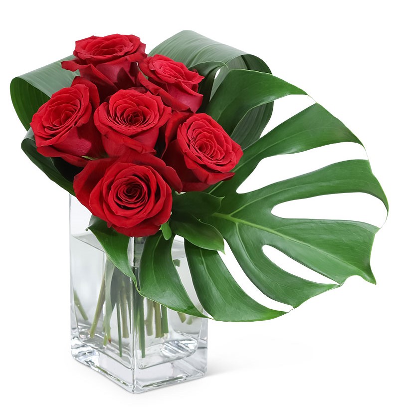 Red roses have always been the symbol of love and romance, and continue to be the best way to send your love. This modern rose design takes the old classic to the next level. Six red roses tucked masterfully into a Monstera leaf, are sure to make a bold statement of love for your special someone. Modern Roses would make a perfect anniversary or romantic gift.