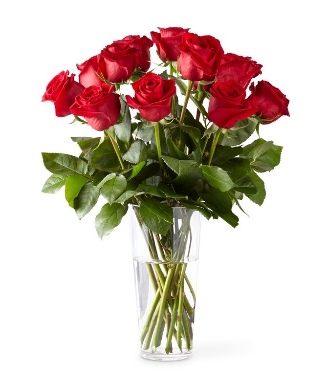 Our Elegant Rose Bouquet brings together lush red roses to make a lasting impression. One dozen (12) gorgeous long stem red roses are simply accented with a variety of fresh greens and perfectly situated in a classic glass vase to create a flower bouquet that conveys your hearts deepest desires for love and romance.