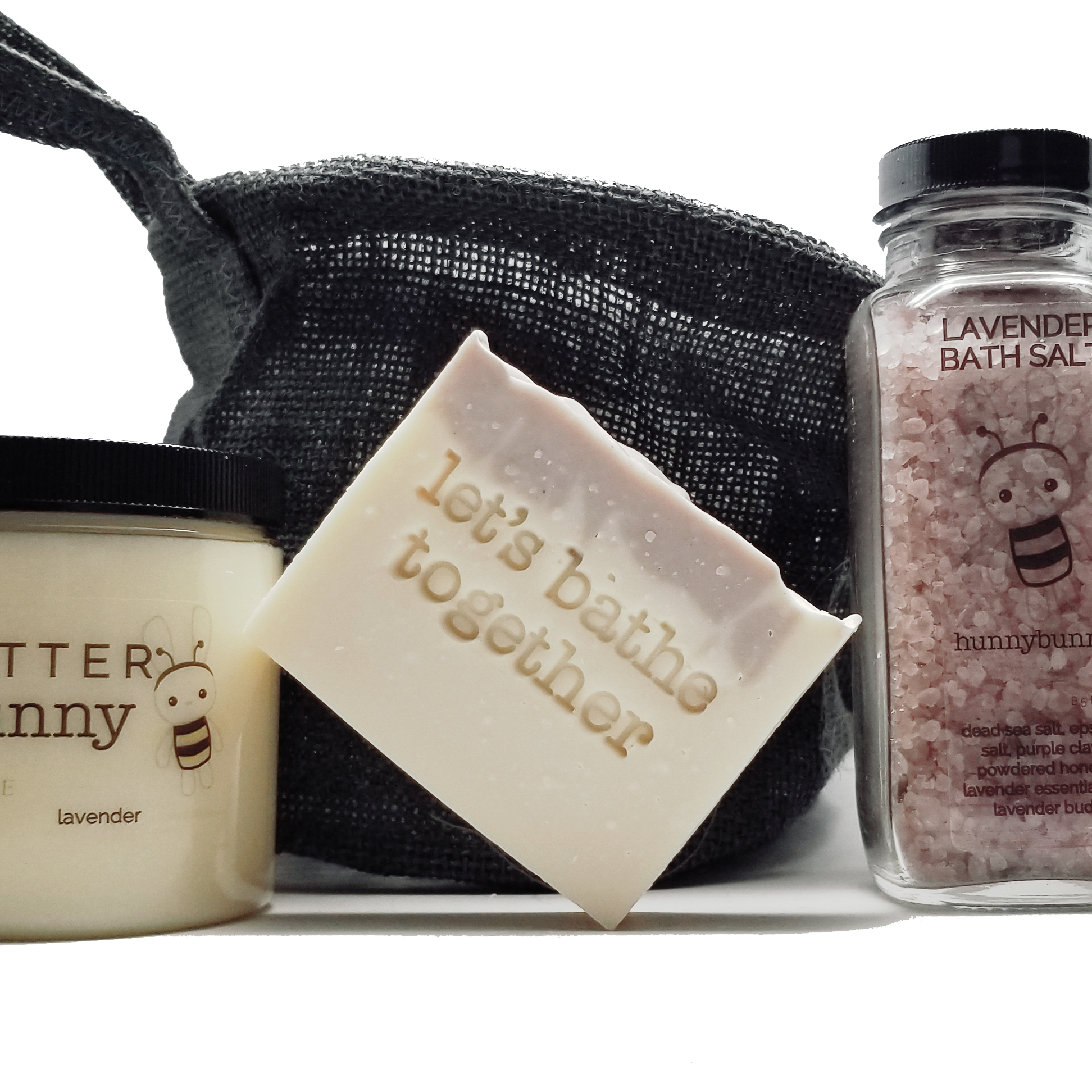 Perfect for that stressed, overworked go-getter who needs a break, our Love & Lavender basket gives our suite of relaxing spa and bathing treatments featuring lavender. It includes the following: 1. Cloth Gift Basket (or similar) 2. Lavender Bath Salt 3. Olive Oil Body Bar (with lavender essential oil used for scent) 4. Lavender Body Butter (8oz) INGREDIENTS: (Body Bar) Olive Oil, Distilled Water, Sodium Hydroxide (does not remain after soap making process), Lavender Essential Oil, Purple Clay. (Body Butter) Grapeseed oil, Shea butter, Cocoa butter, Cera Bellina Wax, Essential (or Plant-Based) Oils, Vitamin E. (Bath Salt) Dead Sea Salt, Epsom Salt, Purple Clay, Lavender Essential Oil, Lavender Buds & Cornflower Petals. hunnybunny pure. simple