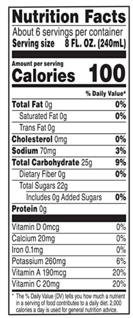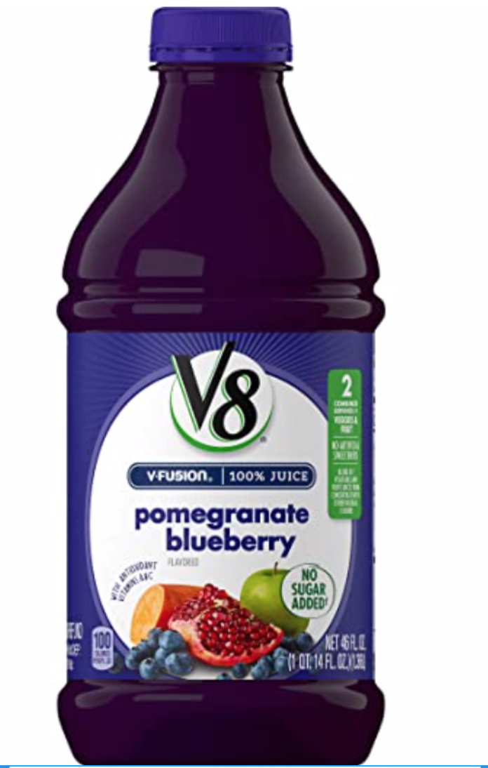 V8 Pomegranate Blueberry 46 oz. Bottle 100 percent Juice, no artificial sweeteners, no sugar added [NOT A LOW CALORIE FOOD. SEE NUTRITION FACTS PANEL FOR SUGAR AND CALORIE CONTENT] 1 serving of vegetables and 1 serving of fruit [8 FL. OZ. JUICE HAS 1/2 CUP VEGETABLES AND 1/2 CUP FRUIT. DIETARY GUIDELINES RECOMMEND 2 1/2 CUPS OF A VARIETY OF VEGETABLES AND 2 CUPS OF FRUIT PER DAY FOR A 2,000 CALORIE DIET] Antioxidant vitamins A & C No artificial flavors or colors; no preservatives added Non GMO & Gluten Free