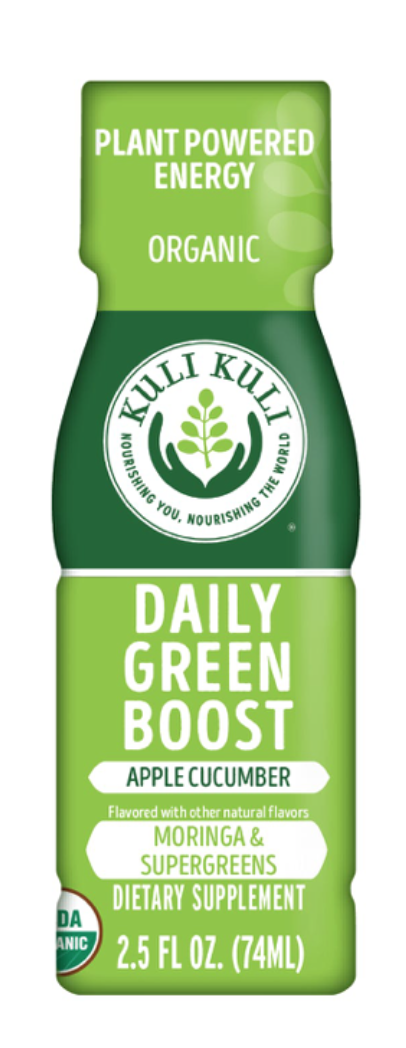 Kuli Kuli’s new line of organic moringa shots are packed with more superfoods than ever before to to give you the plant-powered boost you need for any occasion. Powered by five super greens including Moringa, Spinach, Spirulina, Chlorella and Wheatgrass that synergistically work together to provide daily revitalization. These shots are shelf stable but best served chilled. Organic Moringa Powder, Organic Tapioca Syrup, Organic Lemon Juice, Organic Wheatgrass Powder, Organic Spirulina Powder, Organic Chlorella Powder, Organic Spinach, Water, Organic Green Tea Extract, Natural Apple Flavor, Natural Spearmint Flavor, Xanthan Gum Free From GMOs Free From Gluten Non-GMO Project Verified USDA Organic Fruity Cucumber Apple
