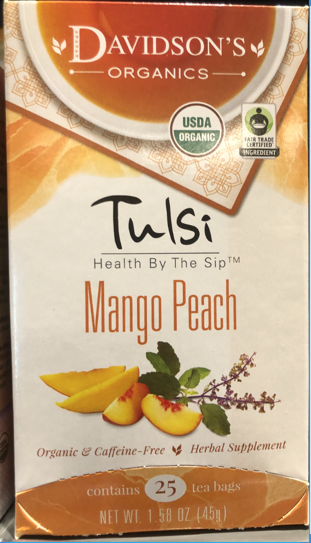 Tulsi Mango Peach combines fruit essence and rooibos with three adaptogenic varieties of Tulsi (Krishna, Rama, and Vana). Tulsi is a sacred, Indian herb that is commonly referred to as the Holy Basil or the Elixir of Life. The herb is in the basil family, but rather carries a light, minty taste. Organic tulsi, organic rooibos, and natural flavor.
