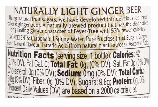 Fever-Tree Ginger Beer Typical values per 100ml ENERGY 158 kJ 37 kcal TOTAL CARB 9.2 g PROTEIN, FAT, FIBRE, SALT 0 g * of which sugars: 4g By brewing a blend of three gingers from Nigeria, Cochin and the Ivory Coast Fever-Tree has created an award winning ginger beer has been highly acclaimed by gastronomes and critics alike. A naturally brewed product, that contains a unique blend of the finest gingers, subtle botanicals flavours and spring water. Not too sweet on the palate and with a deep long lasting ginger character. Perfect in a Dark & Stormy, Moscow Mule or non-alcoholic Gunner. Equally delicious as a long drink on its own.