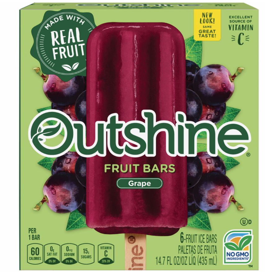 Outshine Grape 6 Count Get ready to Snack Brighter. Outshine & Outgive: We know just how essential fruits and veggies are. They're an important part of a healthy lifestyle and can help you live a better life. That's why we use real fruits and veggies in our products. It's also why we work with local food banks to bring fruits and veggies to communities that need better access to fresh produce. That's our promise.