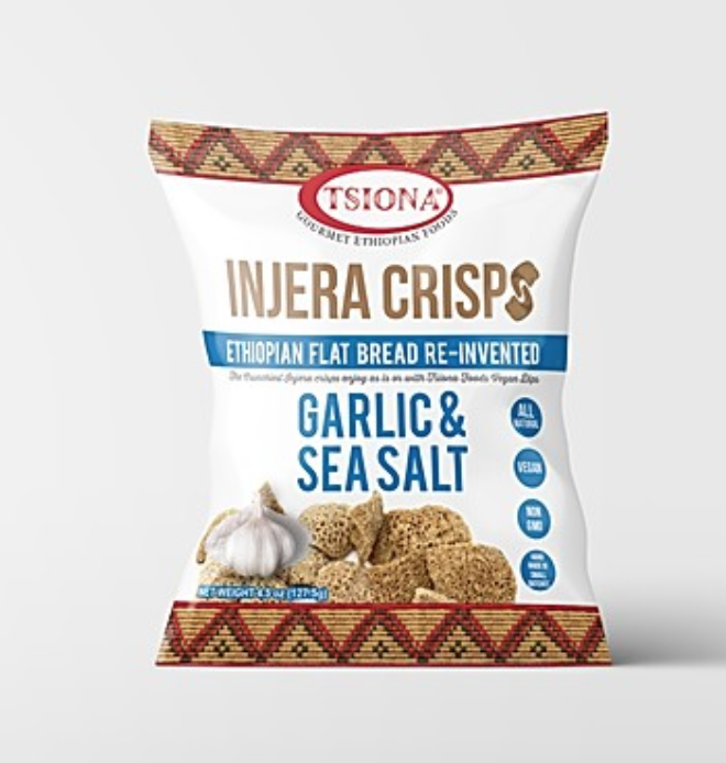 Garlic & Sea Salt Injera Crisps Oh! Yummy is what we hear when they try our Injera Chips / Crisps Garlic & Sea Salt. Ethiopian Flat Bread Re-invented. INGREDIENTS: Injera: Enriched Self Rising Wheat Flour ({Wheat Flour, Niacin}), Iron, Thiamin Mononitrate, Riboflavin, Folic Acid, Salt, Monocalcium Phosphate, Baking Soda, Barley Flour, Teff Flour, Water, Canola Oil and/or Sunflower Oil, Garlic, Sea Salt, and Other Spices.