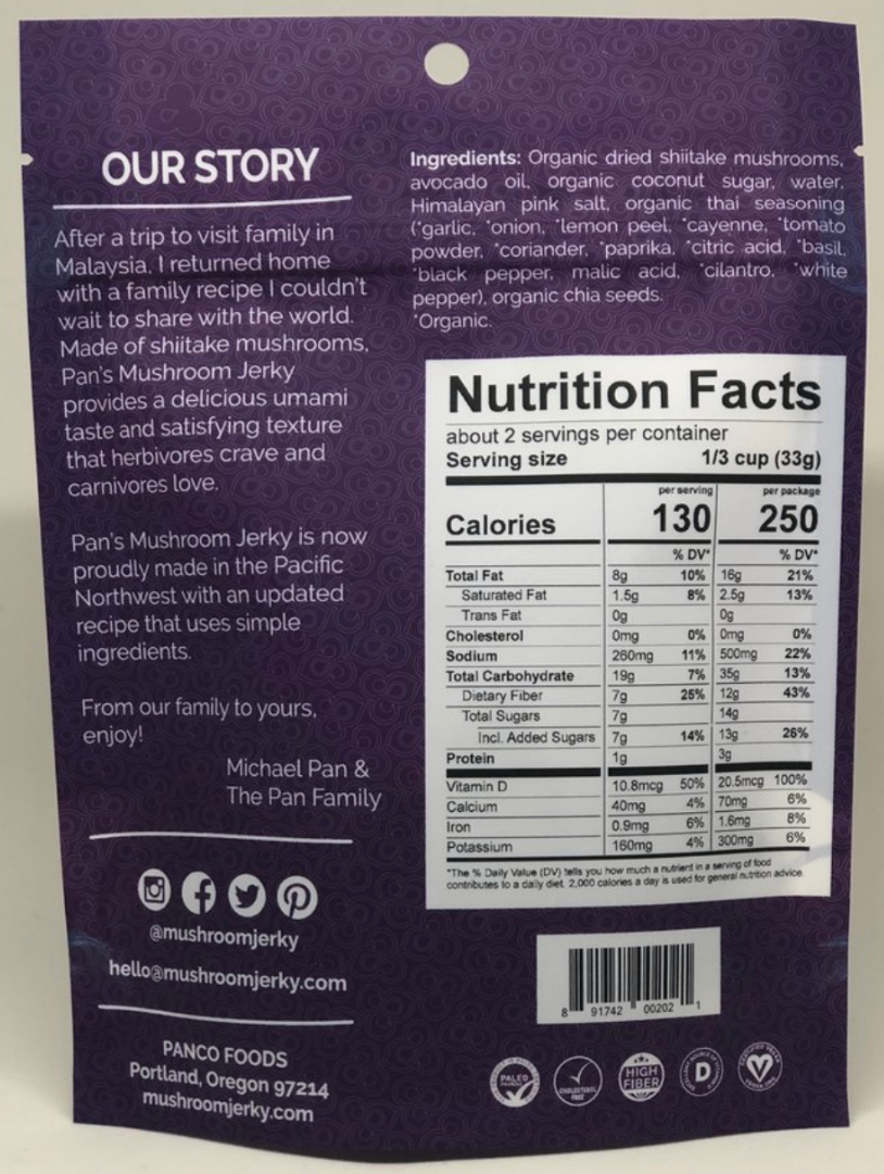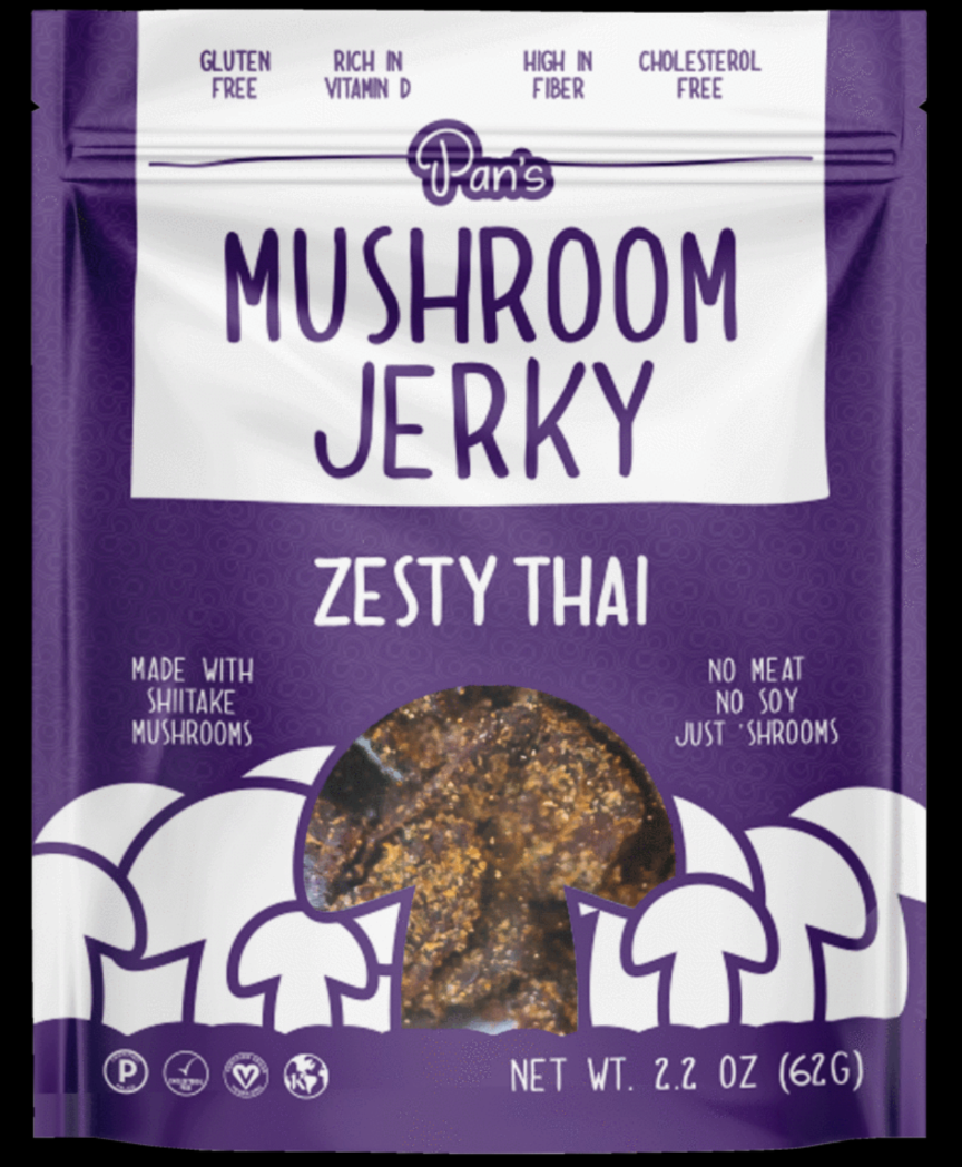 Organic dried shiitake mushrooms, avocado oil, organic coconut sugar, water, himalayan pink salt, organic thai seasoning (organic garlic, organic onion, organic lemon peel, organic cayenne, organic tomato powder, organic coriander, organic paprika, organic citric acid, organic basil, organic black pepper, malic acid, organic cilantro, organic white pepper), organic chia seeds.
