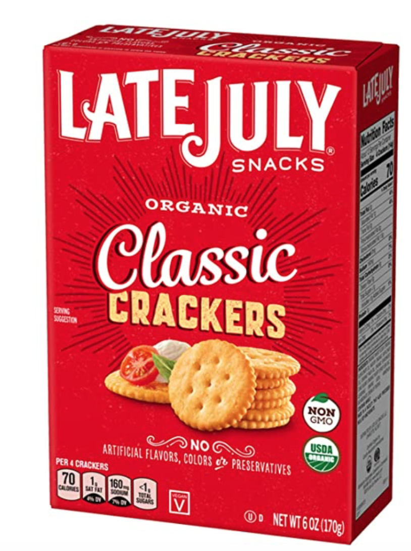 LATE JULY Organic Classic Rich Crackers 6 oz box Flaky, buttery-tasting organic crackers with a lightly sweet and toasted flavor. These organic crackers are tasty on their own or paired with cheese. 0g trans fat or high fructose corn syrup; kosher and vegan. Organic snack crackers made with no artificial flavors, colors or preservatives.