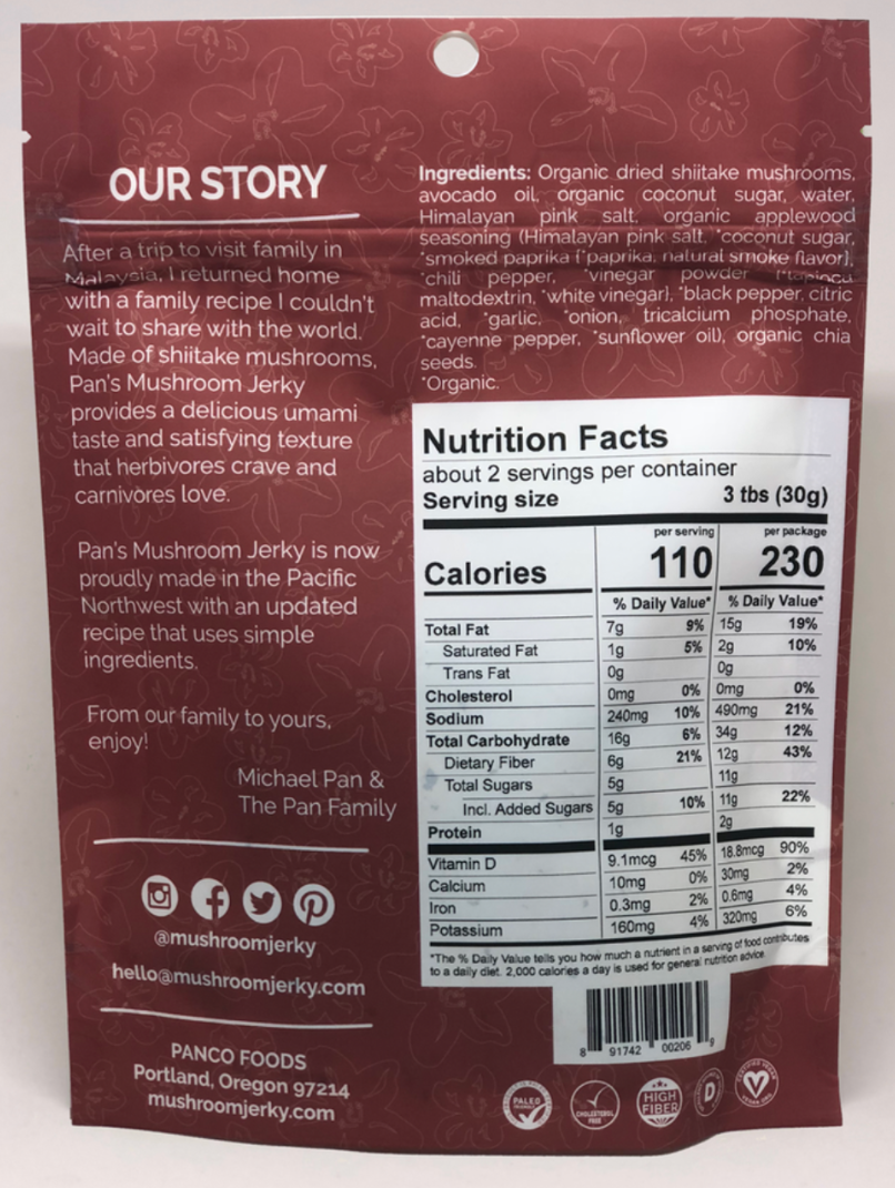 Organic dried shiitake mushrooms, avocado oil, organic coconut sugar, water, himalayan pink salt organic applewood seasoning (himalayan pink salt, organic coconut sugar, organic smoked paprika {organic paprika, natural smoke flavor}, organic chili pepper, organic vinegar powder {organic tapioca maltodextrin, organic white vinegar}, organic black pepper, citric acid, organic garlic, organic onion, tricalcium phosphate, organic cayenne pepper, organic sunflower oil), organic chia seed.