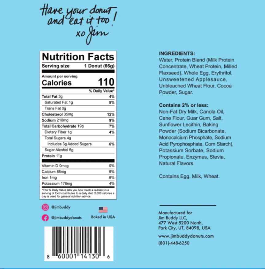 Water, Protein Blend (Milk protein concentrate, wheat protein, milled flaxseed), Whole egg, Erythritol, Unsweetened Applesauce, Unbleached Wheat flour, Cocoa Powder, Sugar, Contains less than 2% of: Non-Fat Dry Milk, Canola Oil, Bleached Wheat Flour, Baking Powder (Sodium Bicarbonate, Monocalcium Phosphate, Sodium Acid Pyrophosphate, Corn Starch), Guar Gum, Sunflower Lecithin, Cane Flour, Salt, Potassium Sorbate, Sodium Propionate, Enzymes, Stevia, Natural Flavors.