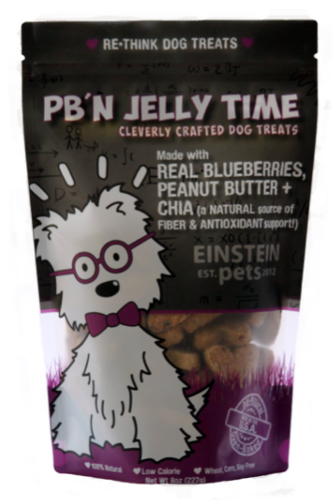 Natural and organic oat flour, peanut butter, blueberries, chia seeds. All-Natural Low In Fat Health-Focused Free From Soy Free From Sugar High In Fiber Low In Calories Small-Batch Free From Corn Coconut Einstein Pets signature natural, organic Peanut Butter and Blueberries Dog Treats. Time for you to get your own biscuit! Einstein Pets favorite!! A classic PB&J. All-natural peanut butter and blueberries come together to make this healthy and delicious treat!