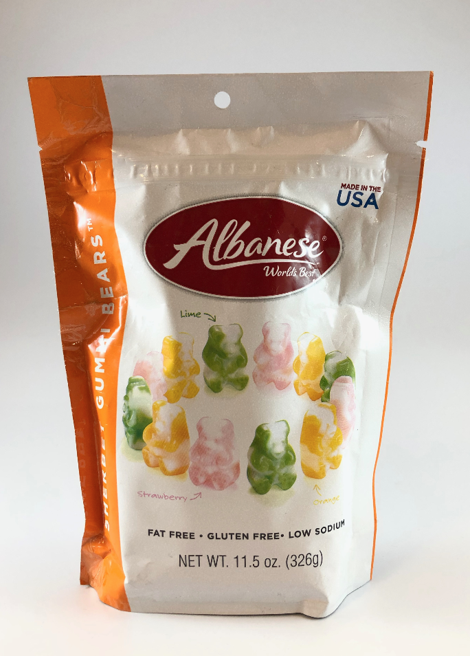 New assorted 12 flavors of Albanese gummi bears. Ornery orange, poppin pineapple, Granny Smith apple, ripe watermelon, lickin lemon, wild cherry, mighty mango, luscious lime, fresh strawberry, rocking raspberry, groovy grapefruit and Concord grape. Made in USA. Low Fat · Gluten-free · Gummy · Candy · Bear · Bag · 11.5 oz