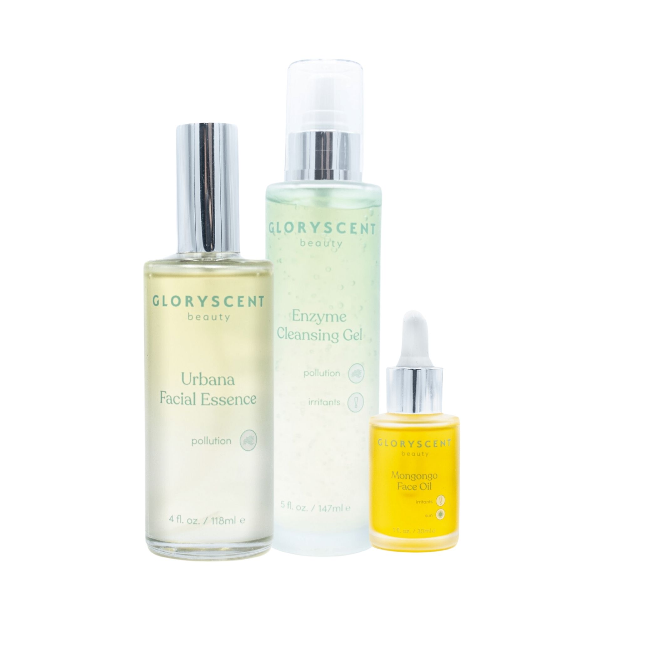 Protect Your Skin From The Environment A trio of daily skincare essentials for a balanced and healthy complexion. The first step is the Enzyme cleansing Gel, a gentle and non foaming product you are bound to fall in love with. This cleanser leaves your skin notoriously soft without stripping it of it natural moisture. It is loaded with fruit enzymes, arnica and willow bark extracts for superb anti-inflammatory benefits. Follow up with the Urbana Essence for ultimate free radical protection and hydration. This Essence uses ingredients like ginseng, sodium hyaluronate and superoxide dismutase deeply hydrate and protect from daily air pollution. Follow this mist with the Mongongo Facial oil to treat and moisturize and lock in the benefits of the previous products. This unique formulation has proven to level hydration, moisturize dry spots and eczema. Appropriate for all skin types.